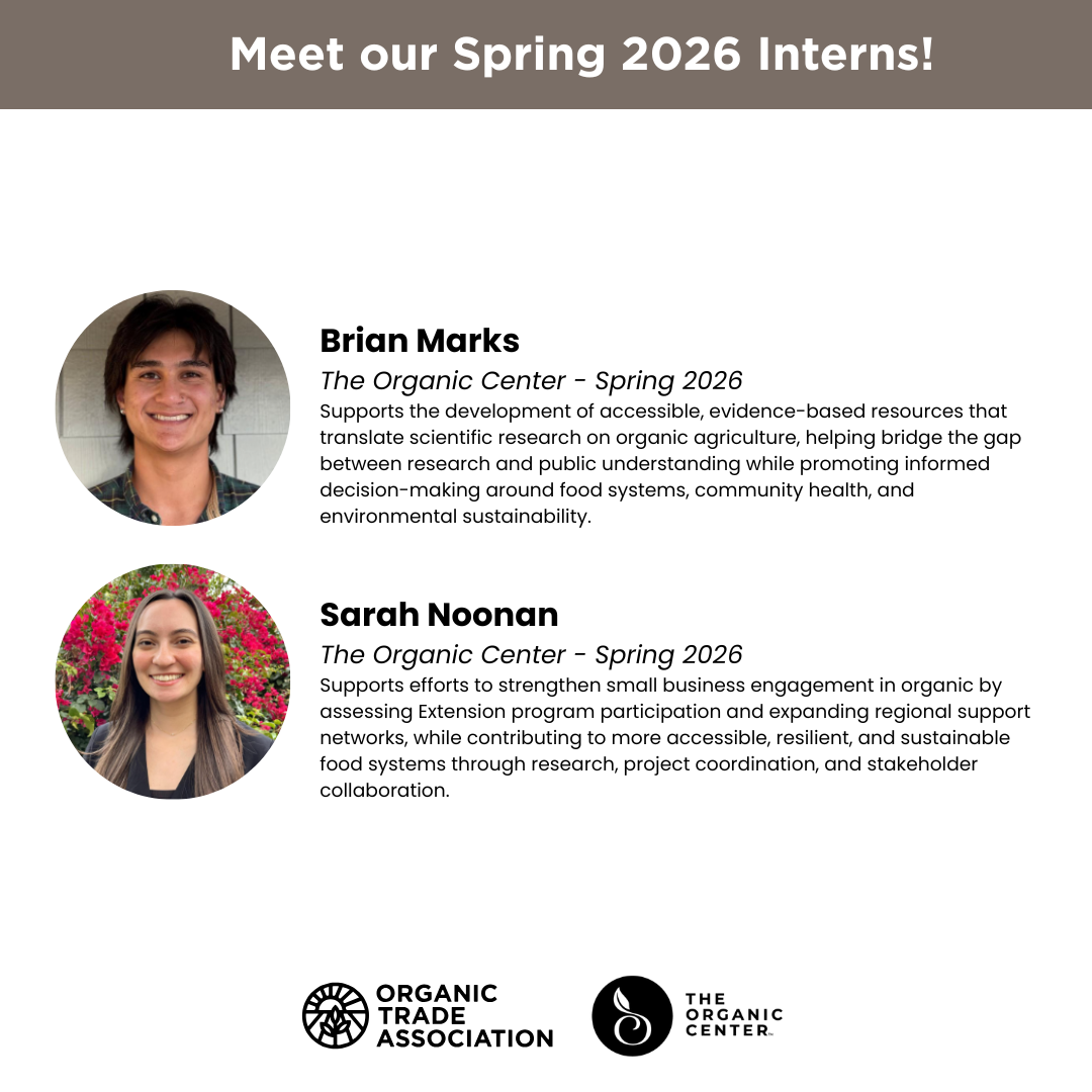 If you’re interested in working with us, please reach out to The Organic Center’s Manager of Science Programs, Dr. Elias Miller at emiller@organic-center.org. To learn more about The Organic Center’s internship programs and to see the work of past fellows and interns, check out our Future of Organic website.