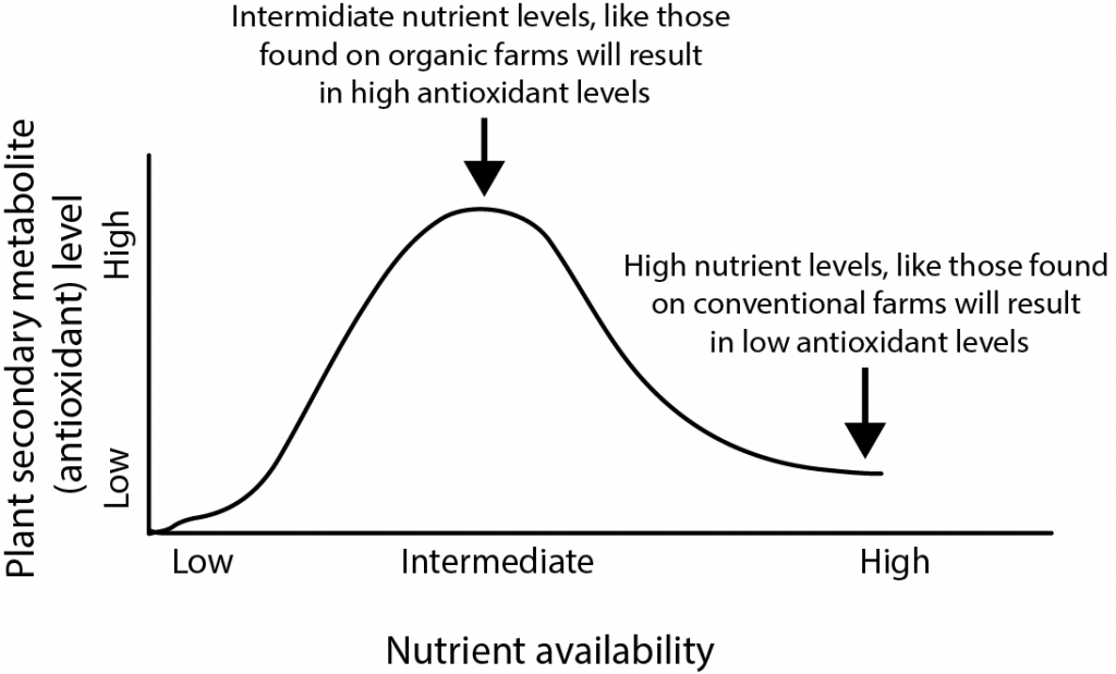 This is illustrated in the accompanying figure showing that the highest levels of antioxidants are found in environments with intermediate levels of nutrients (as a side note, you might notice that very low levels of nutrients will also result in low levels of antioxidants, because there will not be enough resources for creating secondary metabolites nor plant growth. Basically, at very low levels of nutrients you will have an unhealthy plant). These intermediate nutrient conditions are similar to those found on organic farms, while the high nutrient conditions are similar to those found on conventional farms. Thus, intermediate nutrient levels on organic farms should result in crops with higher antioxidant production than crops grown on conventional farms with high nutrient levels.